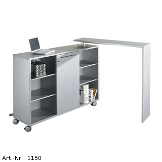 Rollbar und teilabschließbar. Ideal als Empfangsthresen bei Veranstaltungen, Glasfront, Ansatzwinkel beliebig ausrichtbar.